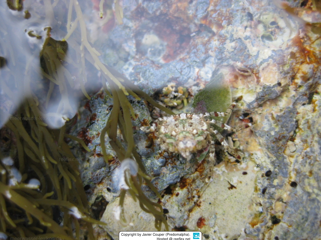 Flattened carapace, octagonal, narrowing towards the front. Carapace sides with teeth on each side. The color varies depending on the habitat, ranging from lime green to almost black, with or without whitish mottling.