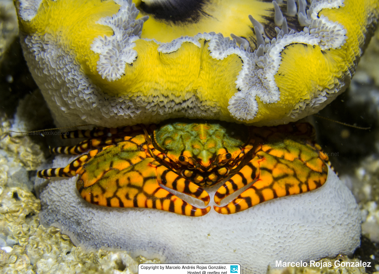 Allopetrolisthes spinifrons also occurs on the echinoderms Stichaster striatus Muller and Troschel, 1840, Meyenaster gelatinosus (Meyen, 1834), Heliaster helianthus