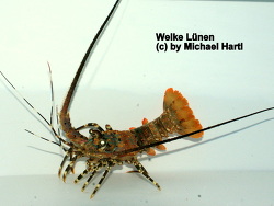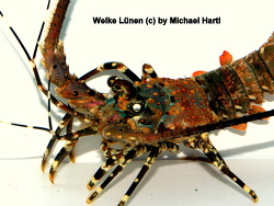 Panulirus homarius: Conspicuous yellow white lines on brown to green legs. Sixteen inches in length.