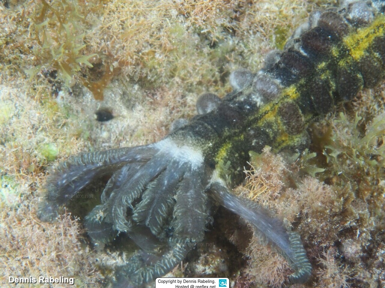 This is a long, wormlike sea cucumber, so extensible that exact measurements are difficult. Its skin is sticky because spicules extend from it. A ring of obvious tentacles surround the mouth area (E. lappa). The color is light gray to light brown and can be covered with patches of white.