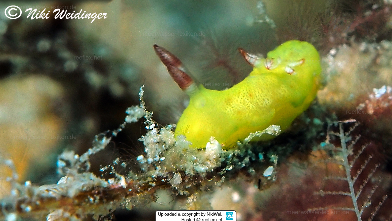 Verconia laboutei is bright yellow or yellow,rhinophores and gills are orange or wine red.On the mantle is sponge-like pattern.Verconia laboutei is very well camouflaged on sponges,their prey.This species live on sandy bottom and in rocky reefs to depth of 12 metres.
