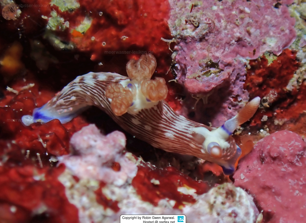 Nembrotha livingstonei is a red-brown or green, on the body are white,orange and brown spots,size and colour of the spots are highly variable.Usually, there is a bright cross-like mark between the rhinophores.