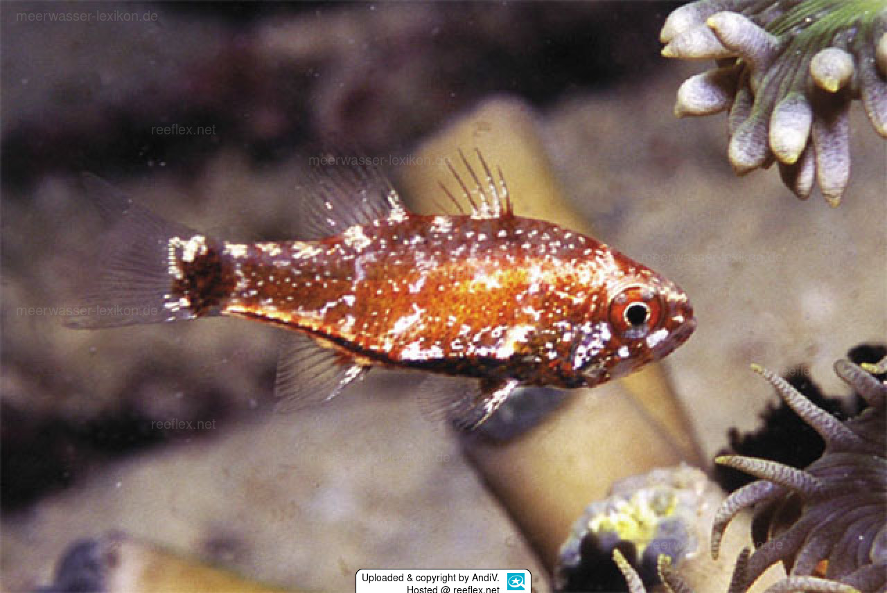 This cardinalfish inhabits sheltered waters of lagoons and coastal inlets where it is often seen in groups of approximately 30-40 individuals, hovering over pocilloporid coral Seriatopora hystrix.