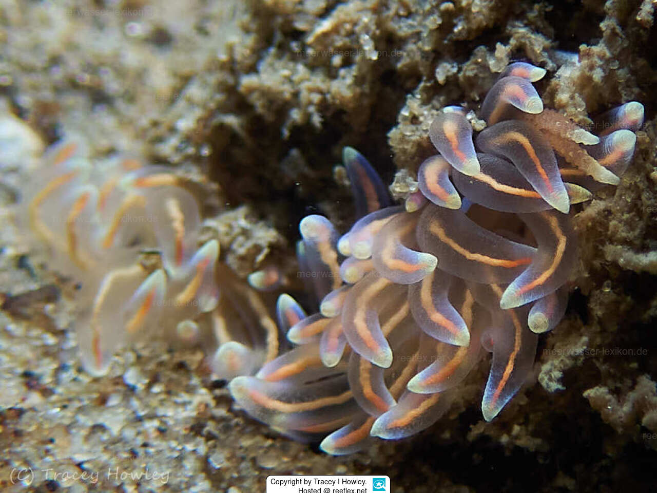 On the translucetn body is a series of white marks down the midline. The cerata are bluish near the end.Rhinophores and oral tentacles with white or cream yellow tips.