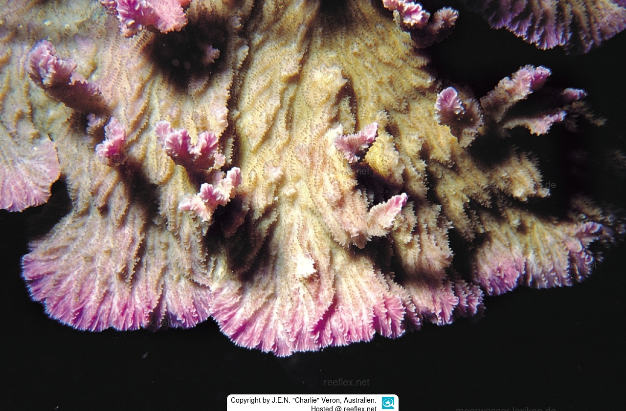 Description: Colonies are laminar or subarborescent, with these different growth-forms characteristically occurring together in large colonies. Valleys are short, straight, and spread in a fan before dividing. They radiate from the colony centre on flat surfaces, but are highly contorted on branches. Flat surfaces often have concentric growth lines. Tentacles are extended only at night. Well developed colonies always have some branch development.